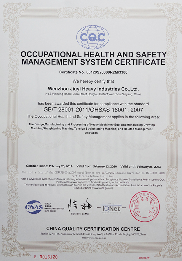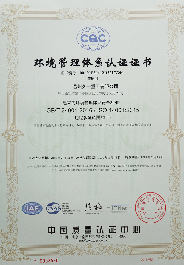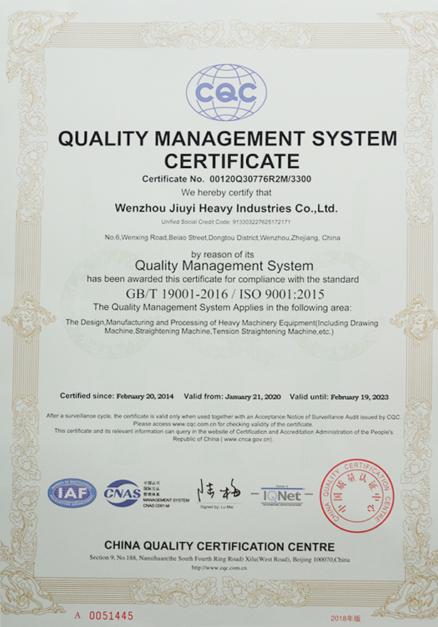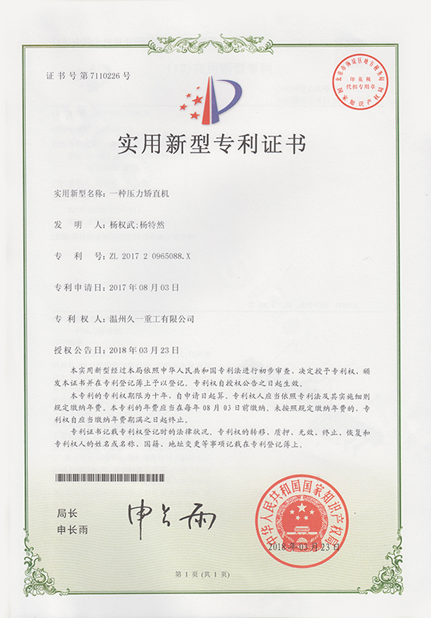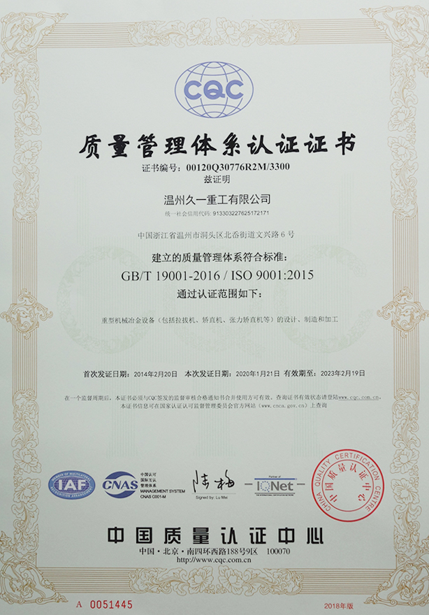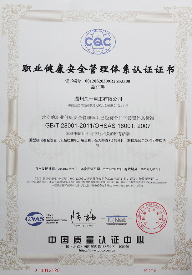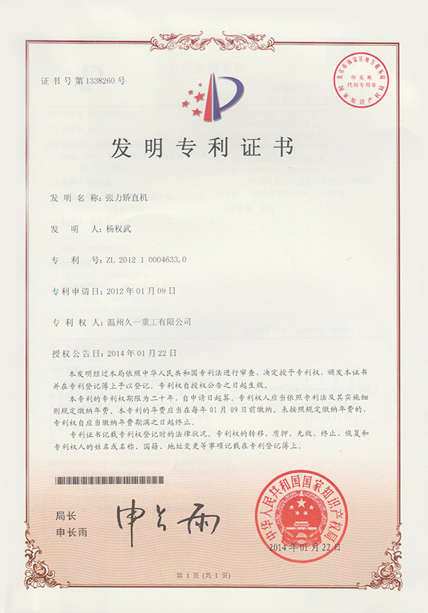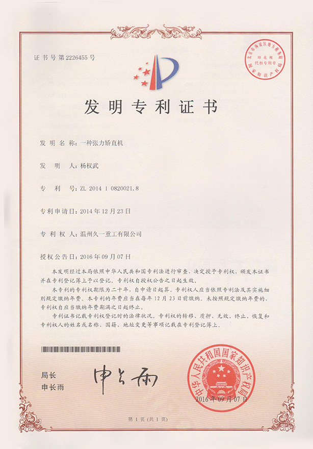溫州久一重工有限公司是一家專業(yè)從事金屬管棒、型材和板材冷加工精整設(shè)備設(shè)計(jì)、制造、銷售的高新技術(shù)企業(yè)。目前主要暢銷產(chǎn)品有:板材拉伸機(jī)(20MN~180MN)、拉彎矯直機(jī)(0.8~15*600~2600)、張力拉伸機(jī)(1MN~60MN)、輥式管棒矯直機(jī)(Φ8mm~Φ960mm)、精密輥式管棒矯直機(jī)(Φ8mm~Φ280mm)、扭擰機(jī)(10~100KN?M)、鏈?zhǔn)嚼浒螜C(jī)(0.5~600T)、懸臂式冷拔機(jī)(3~120T)、液壓冷拔機(jī)(200~2000T)、龍門式型材矯正機(jī)(400~1200MM)、懸臂式型材矯正機(jī)(50~400MM)、壓力機(jī)(100~1200T)、軋頭機(jī)(Φ8~Φ120)、液壓縮頭機(jī)(Φ30~500)等等,并可根據(jù)客戶需要定制各種非標(biāo)產(chǎn)品。目前,客戶涵蓋了海內(nèi)外知名企業(yè),在業(yè)內(nèi)享有了一定口碑和美譽(yù)度。