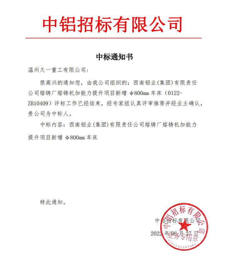 2022年6月27日,久一重工迎得喜訊,成功通過(guò)西南鋁業(yè)(集團(tuán))有限責(zé)任公司熔鑄廠熔鑄機(jī)加能力提升項(xiàng)目的專(zhuān)家組嚴(yán)格評(píng)審并中標(biāo)。